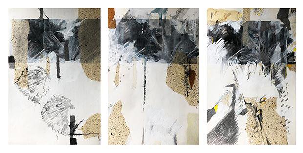 Madhusudhanan shows in his works his enduring fascination with early Indian cinema as a historical medium, replicating film stills and figures from the silent era. Madhusudhanan insists on making a series of images rather than the singular in imitation of the cinematic language. This painting, which comes from memories of the myth of the historical flood closely parallels the story of creation: a cycle of creation, un-creation, and re-creation, in which the Ark plays a pivotal role. The triptych fuses the narrative of the biblical flood in connection to migrants in search of a home.